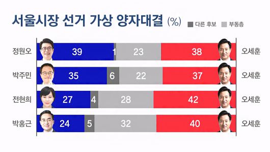 6월 서울시장 선거에서 오세훈 서울시장이, 더불어민주당 후보와 양자 대결할 경우를 가정해 물었더니, 정원오 성동구청장과 박주민 의원이 오 시장과 오차범위 내 접전을 벌이는 것으로 나타났습니다.