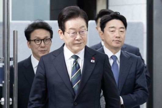 이재명 대통령이 지난해 12월23일 부산 동구 수정동 해양수산부 임시청사에서 열린 국무회의에 입장하고 있다. 왼쪽부터 김민석 국무총리, 이재명 대통령, 강훈식 대통령비서실장. 대통령실사진기자단 |
