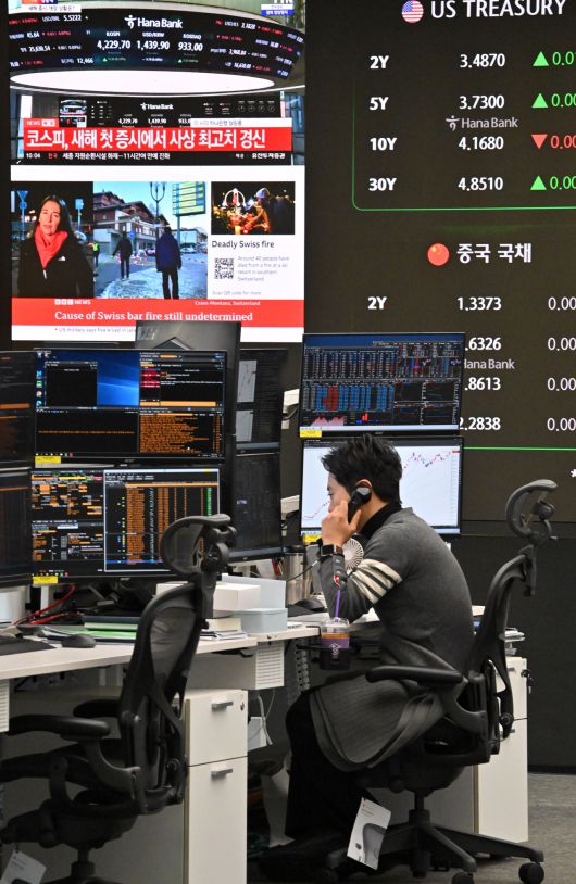 [헤럴드경제=임세준 기자] 2026년 새해 첫 거래일인 2일 코스피가 장중 4238.63까지 치솟으며 장중 기준 사상 최고치를 갱신했다. 이날 오전 서울 중구 하나은행 딜링룸 전광판에 관련 뉴스가 송출되고 있다.