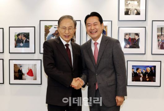 [국회사진기자단] 장동혁 국민의힘 대표가 2일 서울 서초구 영포빌딩에서 이명박 전 대통령을 만나 인사를 나누고 있다.