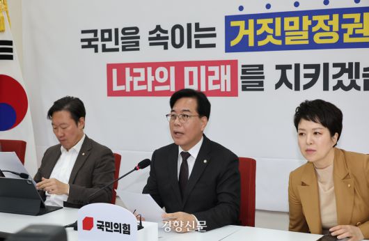 송언석 국민의힘 원내대표(가운데)가 2일 국회에서 가진 현안관련 기자간담회에서 발언하고 있다. 박민규 선임기자 |