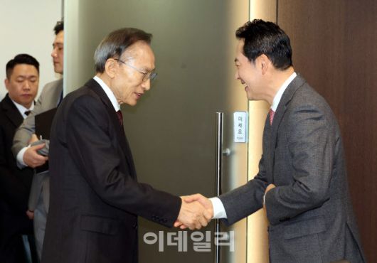 [국회사진기자단] 장동혁 국민의힘 대표가 2일 서울 서초구 영포빌딩에서 이명박 전 대통령을 만나 인사를 나누고 있다.