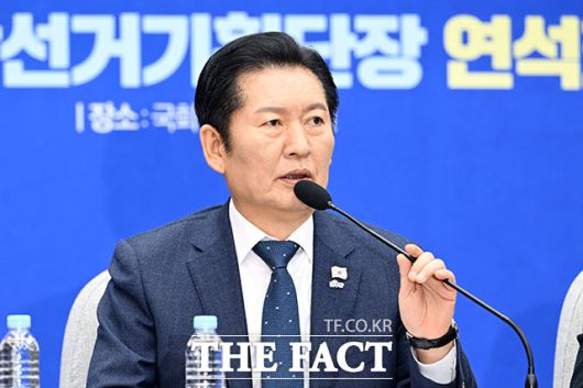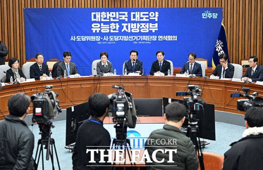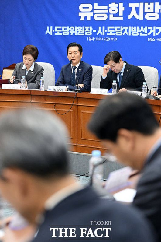 [더팩트ㅣ국회=남용희 기자] 정청래 더불어민주당 대표(왼쪽 두 번째)가 2일 오전 서울 여의도 국회에서 열린 '시도당위원장 및 시도당지방선거기획단장 연석회의'에 참석해 모두발언을 하고 있다.