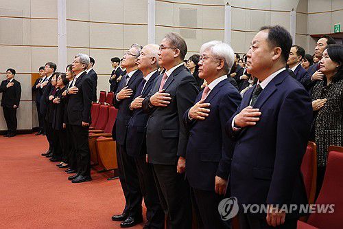 (서울=연합뉴스) 임화영 기자 = 김상환 헌법재판소장과 재판관들이 2일 서울 종로구 헌법재판소 시무식에서 국기에 경례하고 있다. 2026.1.2