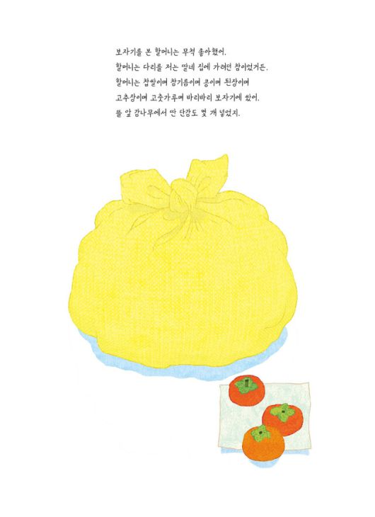 그림 속 노랗게 봉긋이 묶인 보자기는 뜨거운 햇살이 바람이 되어 기다리는 듯하다. 매듭을 풀면 따뜻한 기억이 터져 나올 것 같다. 단감이 굴러다니는 마루에 앉아 보따리를 머리에 괴어 보는 상상을 한다. 엄마의 무릎을 베고 누운 듯 포근하다. 보자기는 그리움을 전하고, 외로움과 두려움을 감싸주고 덮어준다.