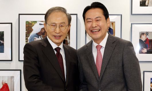 국민의힘 장동혁 대표가 2일 서울 서초구 영포빌딩에서 이명박 전 대통령을 만나 기념 촬영하고 있다. 연합뉴스 |