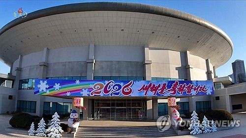 (서울=연합뉴스) 김정은 북한 국무위원장이 새해 첫날인 1일 2026년 설맞이 공연에 출연하는 학생·소년들을 만나 기념촬영했다고 조선중앙TV가 2일 보도했다. 기념촬영 장소인 평양 류경정주영체육관 입구에 '2026 새해를 축하합니다' 현수막이 걸려 있다.[조선중앙TV 화면] 2026.1.2