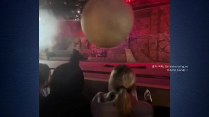 그런데 무대 상단에서 내려온 바위가 갑자기 정해진 궤도를 이탈해 관객석을 향하기 시작합니다.