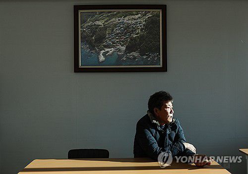 (영덕=연합뉴스) 윤관식 기자 = 2일 경북 영덕군 영덕읍 석리의 마을회관에서 이미상 석리 이장이 마을의 옛 모습이 담긴 사진 아래에서 생각에 잠겨 있다. 석리는 지난해 3월 산불 피해로 마을 전체가 불에 타는 피해를 봤다. 2026.1.2