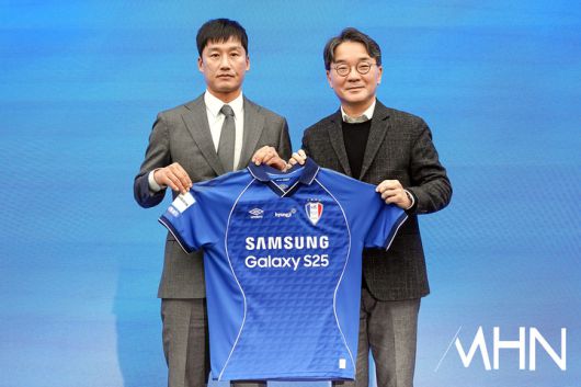 (MHN 수원, 박태성 기자) 2일 수원시 권선구 도이치오토월드에서 K리그2 수원삼성 이정효 감독 취임식이 열렸다. 이정효 감독이 강우영 수원삼성축구단 대표에게서 새로운 유니폼을 전달 받고 있다. <저작권자 Copyright ⓒ MHN / 엠에이치앤 무단전재 및 재배포 금지>