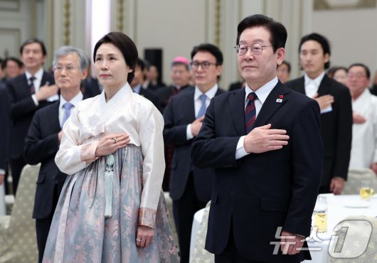 (서울=뉴스1) 이재명 기자 = 이재명 대통령과 김혜경 여사가 2일 청와대 영빈관에서 열린 2026년 신년 인사회에 참석해 국민의례를 하고 있다. 2026.1.2/뉴스12expulsion@news1.krCopyright ⓒ 뉴스1. All rights reserved. 무단 전재 및 재배포, AI학습 이용 금지.