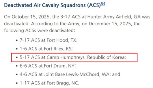 지난달 31일(현지시간) 공개된 미국 의회조사국(CRS) 보고서에 따르면 캠프 험프리스에 주둔 중인 5-17 공중기병대대(ACS)가 지난달 15일부터 비활성화됐다.