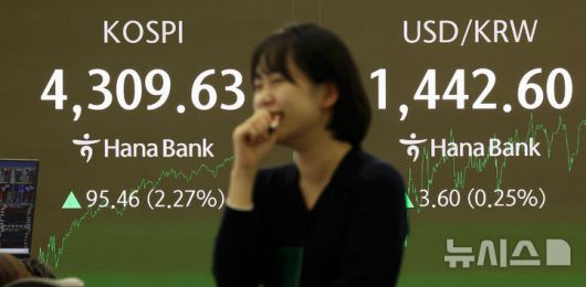 [서울=뉴시스] 홍효식 기자 = 코스피가 전 거래일(4214.17) 보다 95.46p(2.27%) 오른 4309.63에 마감한 2일 오후 서울 중구 하나은행 딜링룸 전광판에 지수가 표시되고 있다.