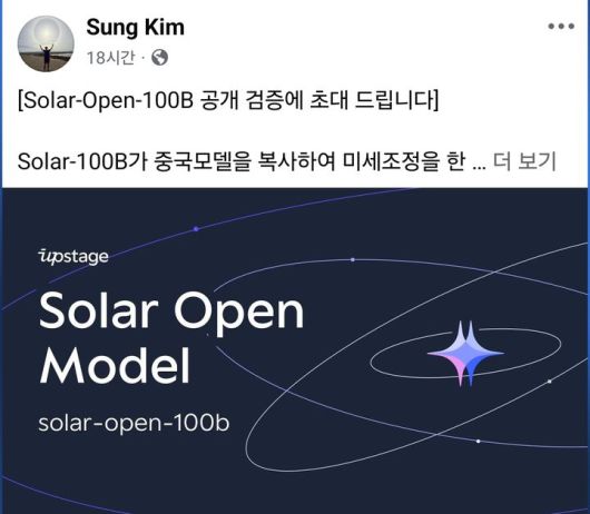 이에 김성훈 업스테이지 대표는 즉각 반박했다. 그는 SNS를 통해 "솔라 오픈 100B가 중국 모델을 복사해 미세 조정을 한 것으로 추정된다는 글에 대해 사실과 다름을 알려드린다"며 "업스테이지는 명백히 프롬 스크래치 방식으로 학습했다"고 강조했다.
