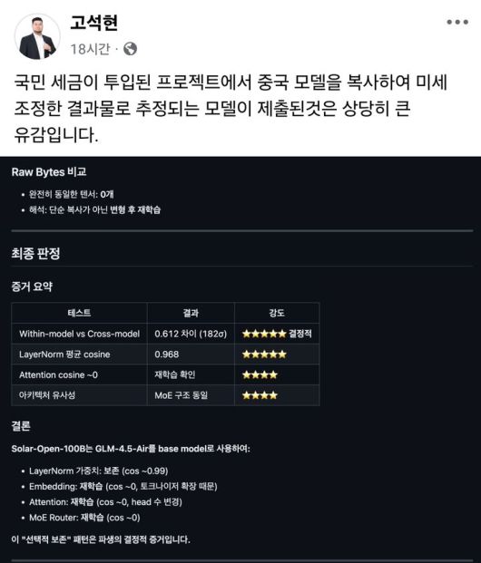 해당 리포트에는 "두 모델과 마이크로소프트의 '파이(Phi)' 모델의 레이어놈(LayerNorm) 파라미터를 비교한 결과, 모두 0.9 이상의 높은 코사인 유사도(cosine similarity)를 보인다"며 "'솔라 오픈 100B'가 'GLM-4.5-에어'에서 파생된 모델이라면, 'GLM-4.5-에어' 역시 'Phi-3.5-MoE-instruct'에서 파생된 모델이어야 한다"는 주장이 담겼다.