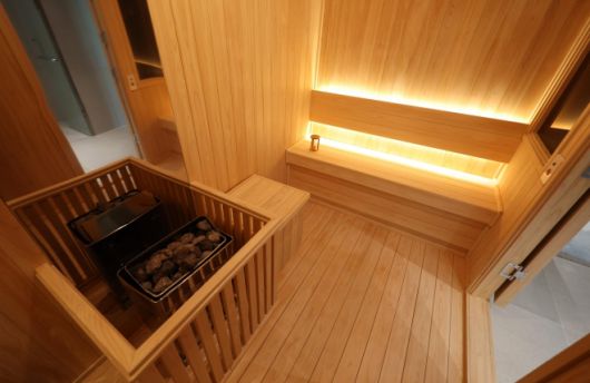 실내에는 편백으로 조성된 건식 사우나가 설치돼 있으며, 사우나 내부에는 TV도 마련돼 있다. 또 사우나 옆 공간에는 화장실과 함께 킹사이즈로 추정되는 침대가 놓인 침실, 소파가 배치된 응접실이 있는 것으로 확인됐다.