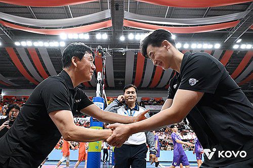 (서울=연합뉴스) 프로배구 최다승 지도자인 신영철 OK저축은행 감독(왼쪽)이 2일 부산 강서체육관에서 열린 프로배구 진에어 2025-2026 V리그 남자부 경기를 앞두고 데뷔전을 앞둔 박철우 우리카드 감독대행과 악수하고 있다. 2026.1.2 [한국배구연맹 제공. 재배포 및 DB 금지]
