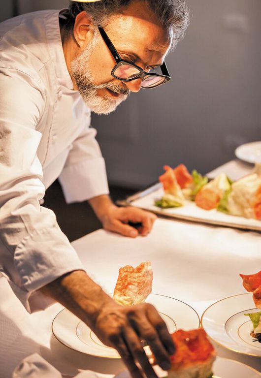 그의 대표 요리 ‘파르미자노 5가지’는 ‘진화하는 전통’이 뭔지 보여준다. 첨단 요리법을 동원해 파르미자노를 부드럽게 부풀린 ‘수플레’, 입안에서 가볍게 터지며 향만 남기는 ‘폼(foam·거품)’, 바삭한 과자의 일종인 ‘웨이퍼’, 촉촉한 액체 상태의 ‘소스’, 솜사탕처럼 뽑아 입에 넣으면 공기처럼 사라지는 ‘에어(air)’ 등 5가지 질감으로 즐길 수 있는 요리를 개발했다.