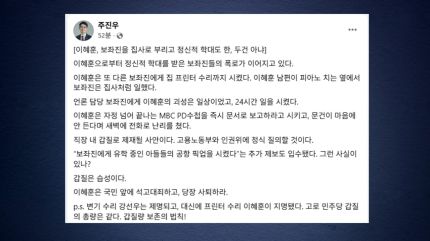 주 의원은 '변기 수리' 강선우 의원은 제명됐고 대신 '프린터 수리' 이 후보자가 지명됐다며, 민주당 갑질의 총량은 같은 '갑질량 보존의 법칙'이라고 비꼬았습니다.