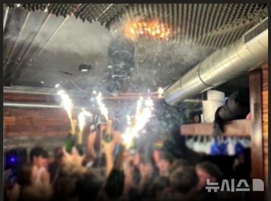 [서울=뉴시스]새해 첫날인 1일 오전 1시 30분께 스위스 발레주 크랑몽타나 스키 리조트 술집 '르 콩스텔라시옹'에서 발생한 화재 사고는 샴페인 병에 꽂아 올린 '스파클러(불꽃 캔들)'에서 발생한 불티가 목재로 된 천장 마감재로 옮겨붙으면서 발생한 것으로 보인다고 스위스 당국이 2일(현지시간) 발표했다. 사진은 화재 직전 천장에 불이 붙는 장면으로 알려진 사진이다. 스위스 공영 SRF는 이 사진이 신빙성이 있다고 보도했다. 2026.01.02 (사진 = 사회관계망서비스 엑스 갈무리) photo@newsis.com |