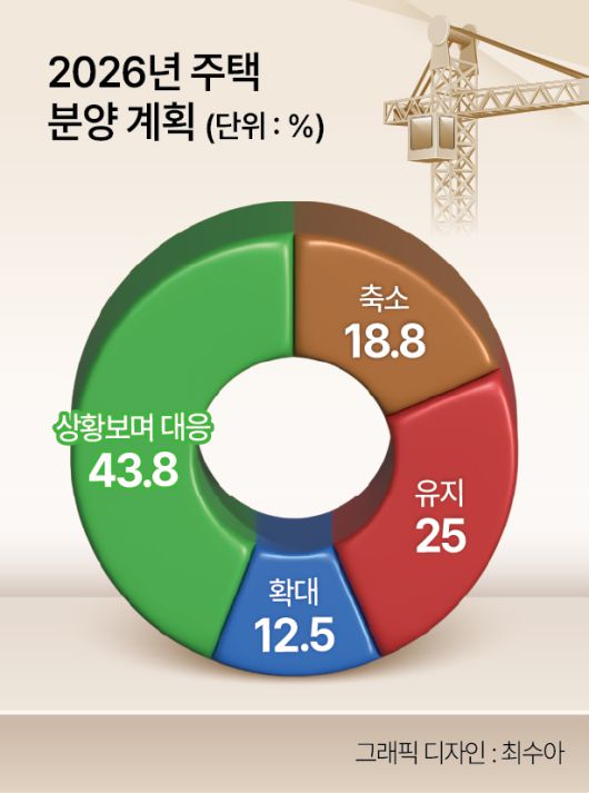 헤럴드경제가 2026년 새해를 맞아 국내 건설업계 16개사 최고경영자(CEO)를 대상으로 설문조사한 결과 올해 주택분양 계획을 묻는 질문에 ‘분양을 늘리겠다’고 응답한 비율은 12.5%(2개사)에 그쳤다.
