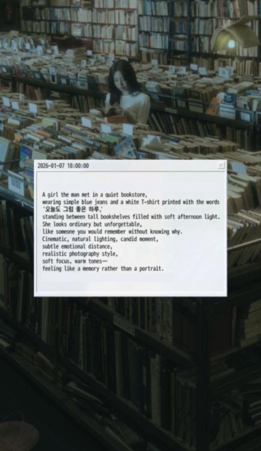 프롬프트 창 속 문장들은 츄로 보이는 인물의 스타일링과 분위기, 공간의 빛과 감정 상태 등을 설명하듯 나열되며, 하나의 장면을 언어로 입력해 이미지로 구현하는 과정을 떠올리게 한다. 이는 서점에서 마주친 한 소녀에 대한 기억과 상상을 프롬프트로 옮긴 뒤 그 언어가 이미지로 생성되는 과정을 구현한 연출로 해석된다.