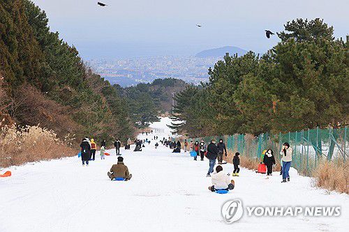 (제주=연합뉴스) 전지혜 기자 = 새해 초 제주에 많은 눈이 내린 가운데 토요일인 3일 제주시 오라동 중산간에서 나들이객들이 눈썰매를 타고 있다. 2026.1.3