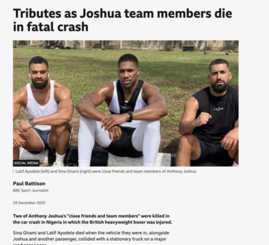 사고는 지난 달 29일 나이지리아 오군주 사가무 인근 고속도로에서 발생했다. 조슈아가 탑승한 렉서스 SUV는 도로에 정차해 있던 트럭과 충돌했다.