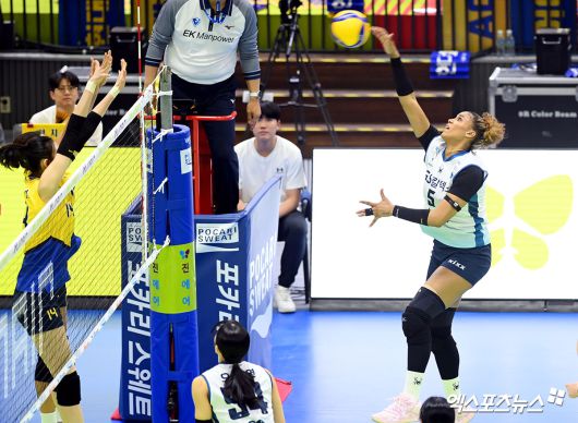 (엑스포츠뉴스 수원, 고아라 기자) 3일 오후 경기도 수원실내체육관에서 열린 '진에어 2025-2026 V-리그' 현대건설과 GS칼텍스의 경기, GS칼텍스 실바가 공격을 시도하고 있다.고아라 기자 iknow@xportsnews.com