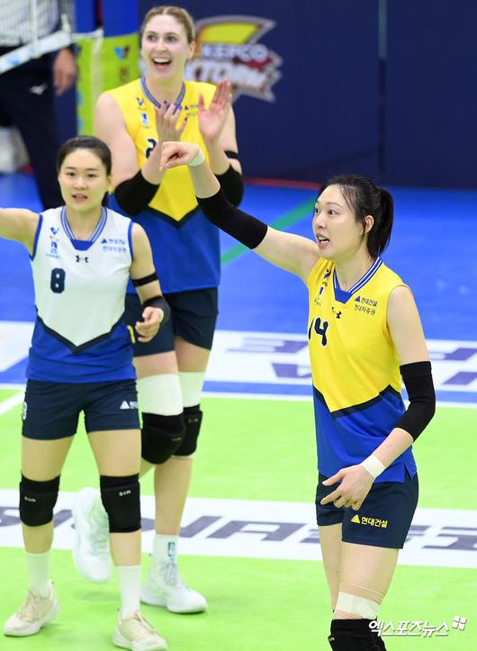 (엑스포츠뉴스 수원, 고아라 기자) 3일 오후 경기도 수원실내체육관에서 열린 '진에어 2025-2026 V-리그' 현대건설과 GS칼텍스의 경기, 현대건설 양효진이 인을 어필하고 있다.고아라 기자 iknow@xportsnews.com