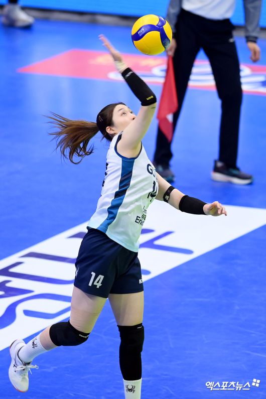 (엑스포츠뉴스 수원, 고아라 기자) 3일 오후 경기도 수원실내체육관에서 열린 '진에어 2025-2026 V-리그' 현대건설과 GS칼텍스의 경기, GS칼텍스가 현대건설에 세트스코어 3:1(25-23 21-25 25-17 25-15)로 승리를 거뒀다. GS칼텍스 김지원이 서브 공격을 하고 있다.고아라 기자 iknow@xportsnews.com