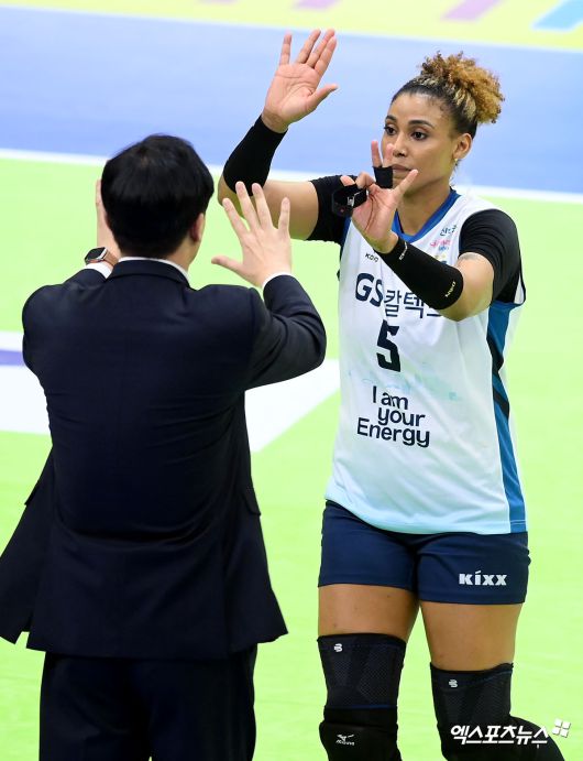(엑스포츠뉴스 수원, 고아라 기자) 3일 오후 경기도 수원실내체육관에서 열린 '진에어 2025-2026 V-리그' 현대건설과 GS칼텍스의 경기, GS칼텍스가 현대건설에 세트스코어 3:1(25-23 21-25 25-17 25-15)로 승리를 거뒀다. GS칼텍스 실바가 이영택 감독과 세리머니를 하고 있다.고아라 기자 iknow@xportsnews.com