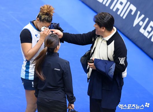 (엑스포츠뉴스 수원, 고아라 기자) 3일 오후 경기도 수원실내체육관에서 열린 '진에어 2025-2026 V-리그' 현대건설과 GS칼텍스의 경기, GS칼텍스가 현대건설에 세트스코어 3:1(25-23 21-25 25-17 25-15)로 승리를 거뒀다. 경기를 마친 GS칼텍스 실바가 차상현 해설위원과 이야기를 나누고 있다.고아라 기자 iknow@xportsnews.com