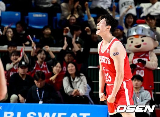 [OSEN=잠실학생체, 조은정 기자] 3일 오후 서울 잠실 학생체육관에서 ‘2025-2026 LG전자 프로농구’ 서울 SK와 안양 정관장의 경기가 열렸다. 홈팀 서울 SK는 15승 12패로 5위, 방문팀 안양 정관은 18승 9패로 2위를 기록 중이다. 4쿼터 SK 김형빈이 3점슛을 넣은 뒤 포효하고 있다. 2026.01.03 /cej@osen.co.kr