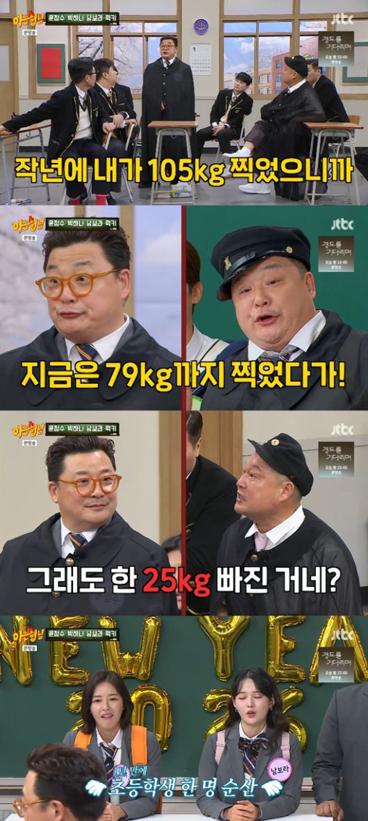 윤정수는 "작년에 내가 105kg 찍었다가 79kg까지 뺐다. 지금은 살짝 증량한 상태다"라고 밝혔고, 현장은 "25kg 정도를 감량한 거냐. 초등학생 한 명이 빠진 거다"라며 놀라움을 드러냈다.
