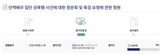 3일 국회 국민동의 청원 게시판에 따르면 지난달 26일 게시된 ‘단역배우 집단 성폭행 사건에 대한 청문회 및 특검 요청에 관한 청원’이라는 제목의 청원에 이날 오후 5시 기준 2만명 이상이 동의한 것으로 나타났다.