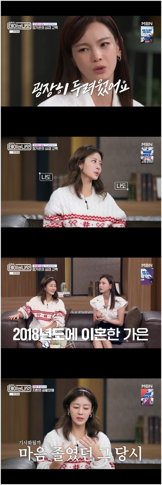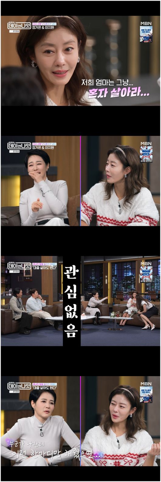 이지현은 이혼 2번을 겪으며 홀로 아이 둘을 양육 중이었다. 그는 “사실 우리 다 이혼을 해 봤지만, 그걸 깨기 위해 정말 엄청난 스트레스로 법적인 소송을 해야 한다”라며 이혼 소송 과정이 힘들었다고 말했다. 정가은은 “저는 2018년도에 이혼을 했다. 지금은 그래도 이혼이 조금 더 말을 하는 분위기인데, 그 당시에는 좀 그랬다. 그게 기사로 나오면 내 인생이 끝날 거 같았다. 그런데 내가 애를 길러야 하고, 방송 활동으로 돈을 벌어야 하는데, 이혼 기사가 나오기까지 정말 너무 두려웠다”라며 그 외의 것도 두려웠다고 말했다.