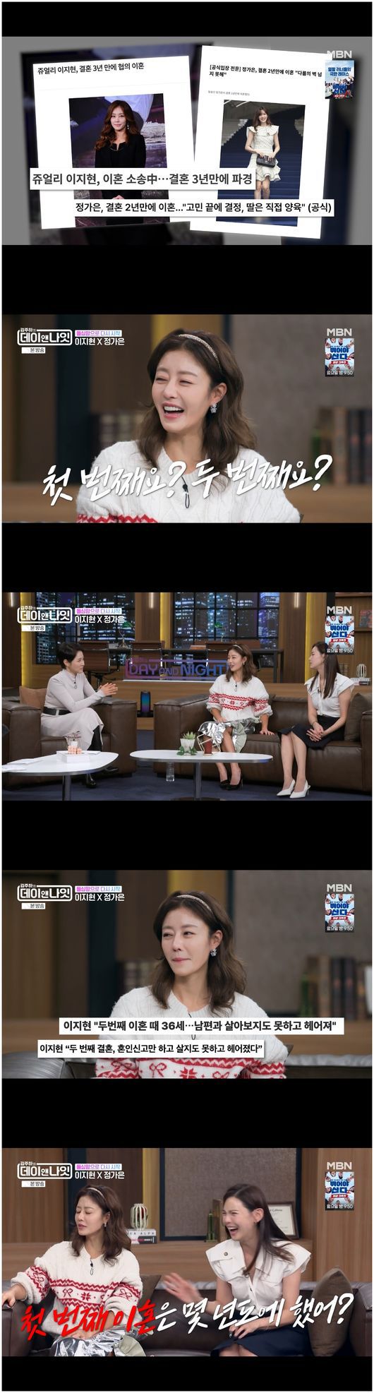 김주하는 “이혼 과정이 힘드시지 않았냐”라며 조심스레 물었다. 정가은은 “휴지를 준비해야 하지 않냐”라며 웃었고, 이지현은 “근데 제가 이혼이 2번이다. 언제 거요?”라며 쿨하게 대답했다.