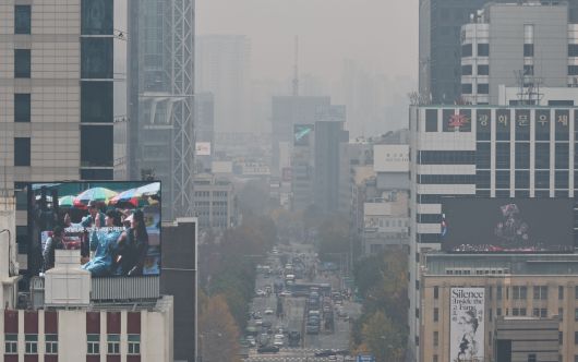 서울과 수도권의 초미세먼지 농도가 ‘나쁨’ 수준을 보였던 지난해 11월 24일 서울 종로구 일대가 뿌옇게 보이고 있다. [연합] |