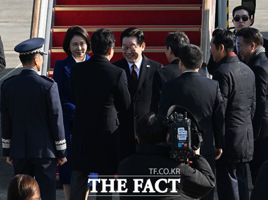[더팩트 | 서울공항=배정한 기자] 3박 4일 일정으로 중국을 국빈 방문하는 이재명 대통령이 4일 오후 경기 성남시 서울공항에 도착해 공군1호기에 오르기 전 강훈식 비서실장과 인사를 하고 있다.