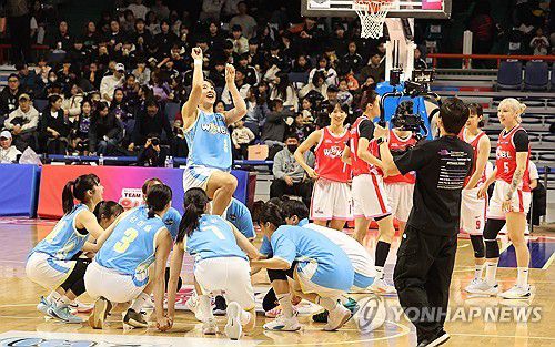 (부산=연합뉴스) 강선배 기자 = 4일 부산 사직체육관에서 열린 BNK금융 2025-2026 여자프로농구 올스타페스티벌. 팀 포니블 김단비(우리은행)와 선수들이 경기 출전 세리머니를 하고 있다. 2026.1.4