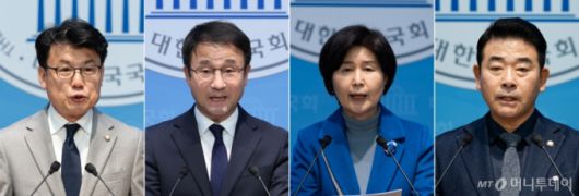 (서울=뉴스1) 신웅수 기자 = 오는 11일 치러지는 더불어민주당 원내대표 보궐선거에 3선 의원 4파전 구도가 윤곽이 드러났다. 사진 왼쪽부터 출마를 선언한 진성준, 한병도, 백혜련, 박정 의원. 2026.1.4/뉴스1 Copyright (C) 뉴스1. All rights reserved. 무단 전재 및 재배포, AI학습 이용 금지. /사진=(서울=뉴스1) 신웅수 기자 |