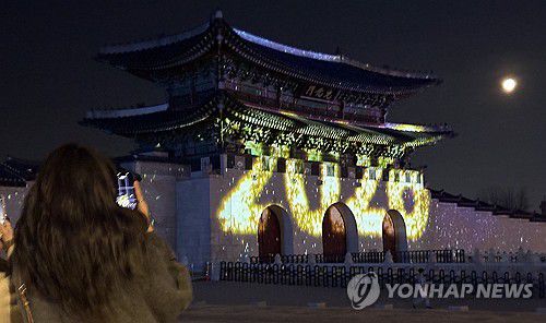 (서울=연합뉴스) 김주성 기자 = 2026년 새해 첫 주말인 4일 서울 종로구 광화문에서 시민들이 초대형 미디어파사드 전시 '2025 서울라이트 광화문'을 관람하고 있다. 2026.1.4