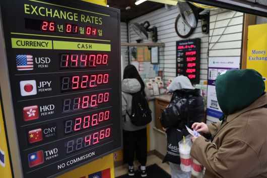 4일 서울 중구 명동의 환전소에서 외국인 관광객들이 환전을 하고 있다. 지난해 원/달러 환율 주간 거래 연평균은 1422.16원으로 외환위기를 겪었던 1998년 평균보다도 높은 역대 최고 기록을 썼다. 이날 금융권에 따르면 5대 금융지주(KB국민·신한·하나·우리·NH농협)는 올해 원·달러 환율이 1300원대로 빠르게 내려가기보다는 상당 기간 1400원대에서 등락을 이어갈 것으로 전망했다. 2026.1.4 (서울=뉴스1) |