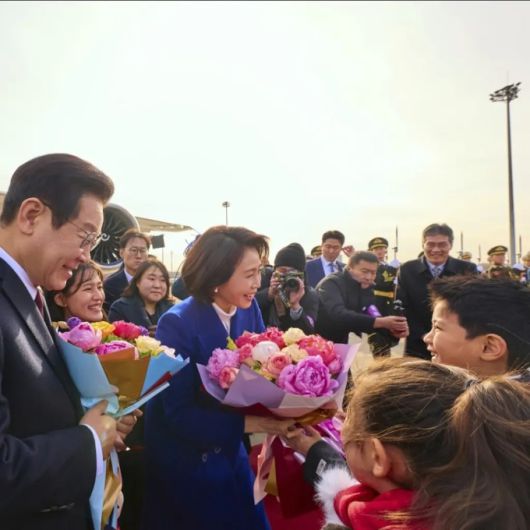 중국 국빈 방문을 위해 4일 오후 서우두공항에 도착한 이재명 대통령이 공항에서 남녀 화동으로부터 방문 환영 꽃다발을 받고 있다. 이 대통령과 김혜경 여사는 직접 화동들과 기념사진을 찍었다. [사진=KTV] |