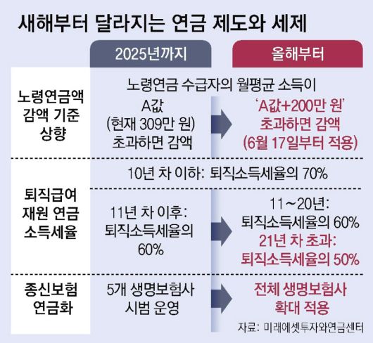 먼저 국민연금부터 살펴봐야 한다. 올해부터 국민연금 보험료율(9%→9.5%)과 소득대체율(41.5%→43%)이 상향된다. 하지만 60세 이상은 이 같은 변화를 크게 느끼지 못할 수 있다. 60세 이상은 보험료 납부 의무가 없고 소득대체율이 상향된다 한들, 받는 연금이 늘어나는 것도 아니기 때문이다.