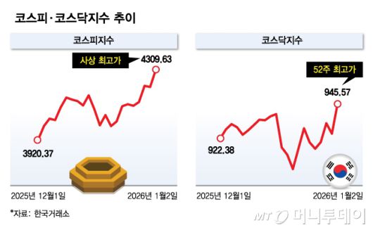 4일 한국거래소에 따르면 국내 증시는 새해 첫 거래일인 지난 2일 반도체산업이 호황을 보일 것이라는 기대감으로 상승했다. 코스피지수는 역대 최고가인 4309.63으로 장을 마감했다. 코스닥지수 역시 52주 최고가인 945.57을 기록했다.