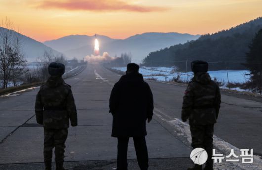 [서울=뉴스핌] 이영종 통일전문기자 = 북한 국무위원장 김정은(가운데)이 4일 오전 평양 역포구역에서 극초음속 미사일 시험발사를 지켜보고 있다. 미사일은 1000km를 비행해 동해상 목표를 타격한 것으로 관영 조선중앙통신이 5일 전했다. [사진=노동신문] 2026.01.05 yjlee@newspim.com |