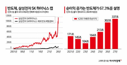 반도체 '쌍두마차'를 향한 장밋빛 전망은 새해에도 계속되는 분위기다. 이날 증권가에서 나온 목표가 상향 리포트 16개 가운데 삼성전자와 SK하이닉스가 6개를 차지했다. 김성노 BNK투자증권 연구원은 "2026년 상반기까지는 삼성전자, SK하이닉스를 중심으로 실적개선 흐름이 이어질 전망"이라며 "2026년 코스피200 지배주주 순이익이 88조7000억원 증가할 것으로 추정되는데 이 중 67.3%(59조7000억원)가 삼성전자, SK하이닉스 실적개선에 의해 이뤄질 것"으로 전망했다.
