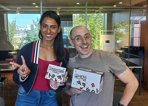 (서울=연합뉴스) 박현수 기자 = 최근 연합뉴스와 인터뷰하며 포즈를 취한 '한글과자' 공동창업자 니디 아그라왈(왼쪽)과 타일러 라쉬. 2026.1.5